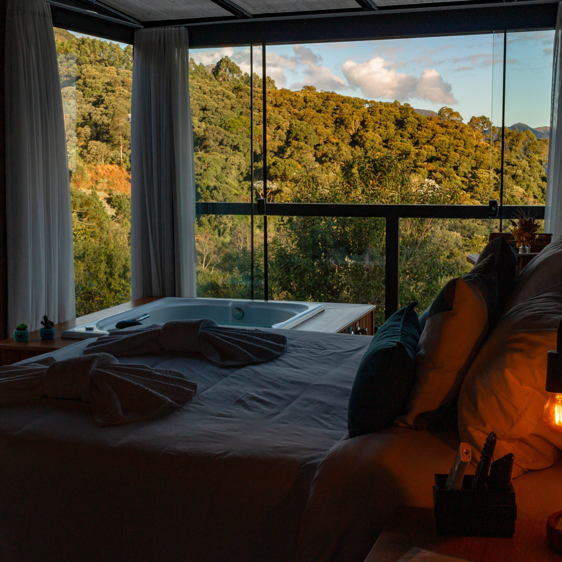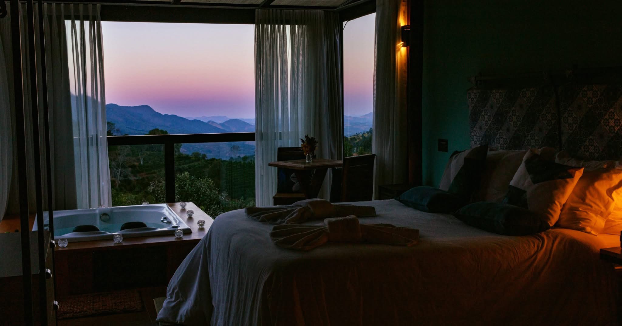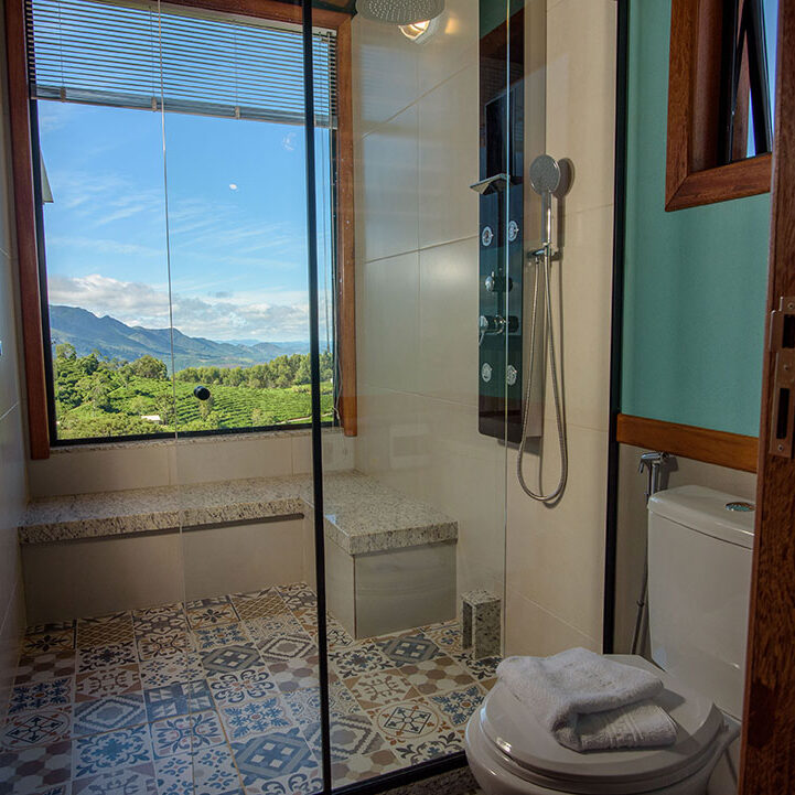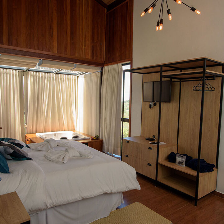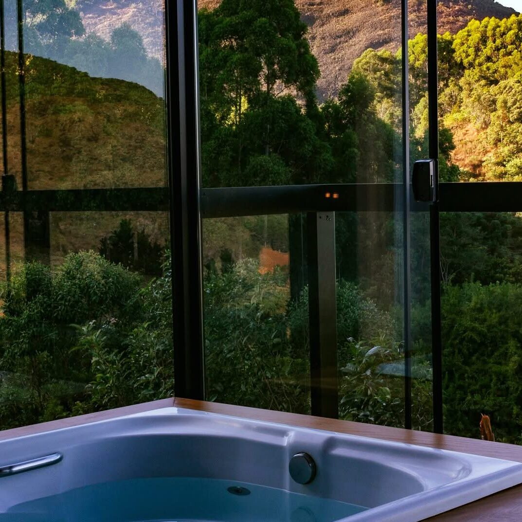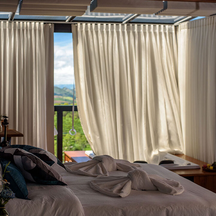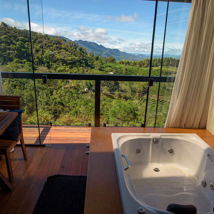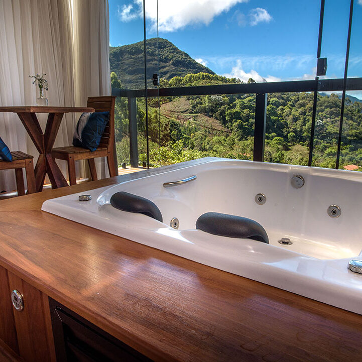 Os chalés possuem varanda em vidro com banheira de hidromassagem e vista privilegiada para as montanhas do Caparaó, banheiro com ducha multidirecional e sauna à vapor exclusiva para o casal, ar-condicionado quente/frio, lareira, cama Queen com lençol térmico, toalheiro térmico, wi-fi, Smart TV com vários canais, sendo ainda equipados com microondas, frigobar, louças e várias amenities.